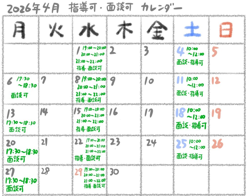 2026年4月の指導可能時間帯と面談可能時間帯のお知らせです。